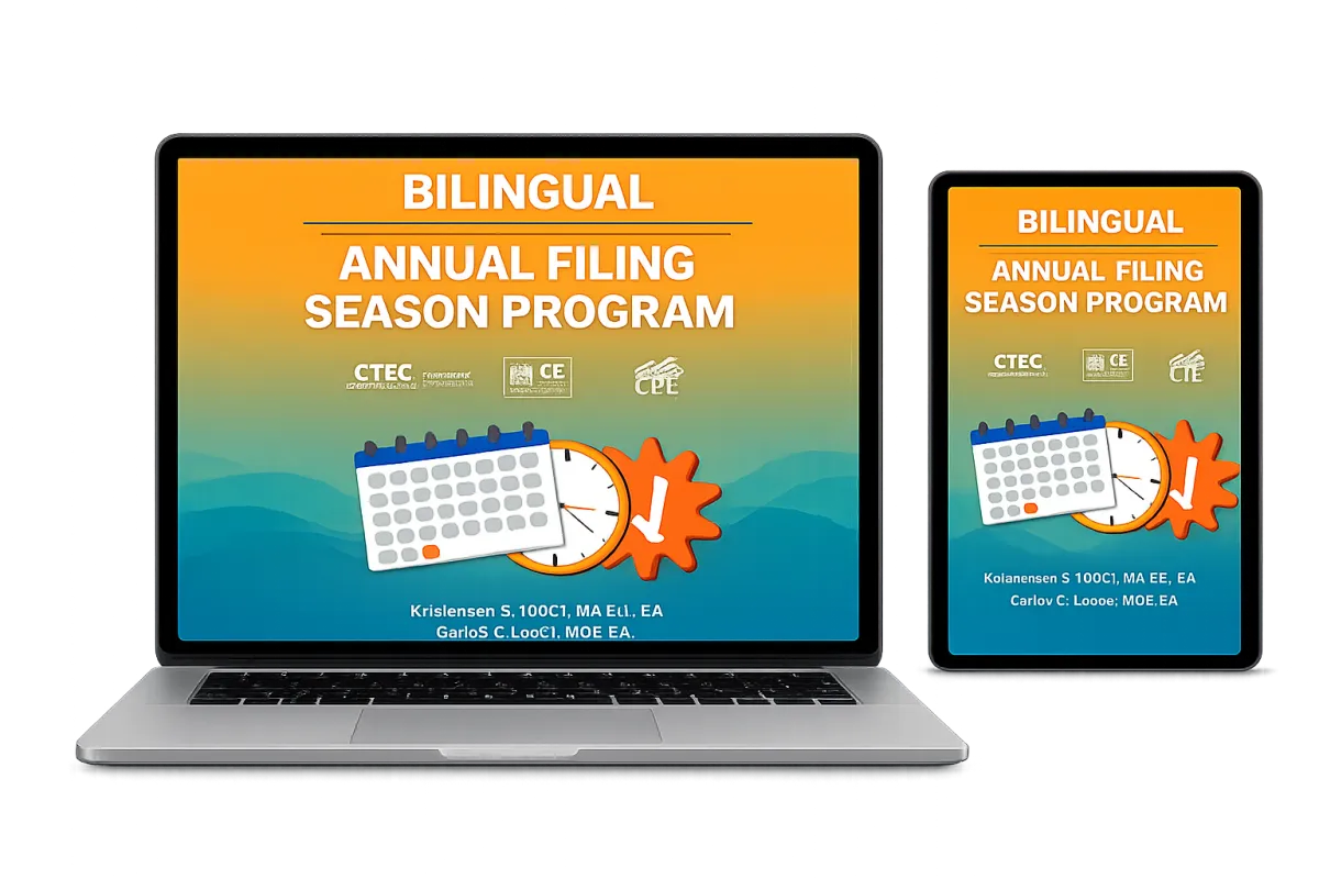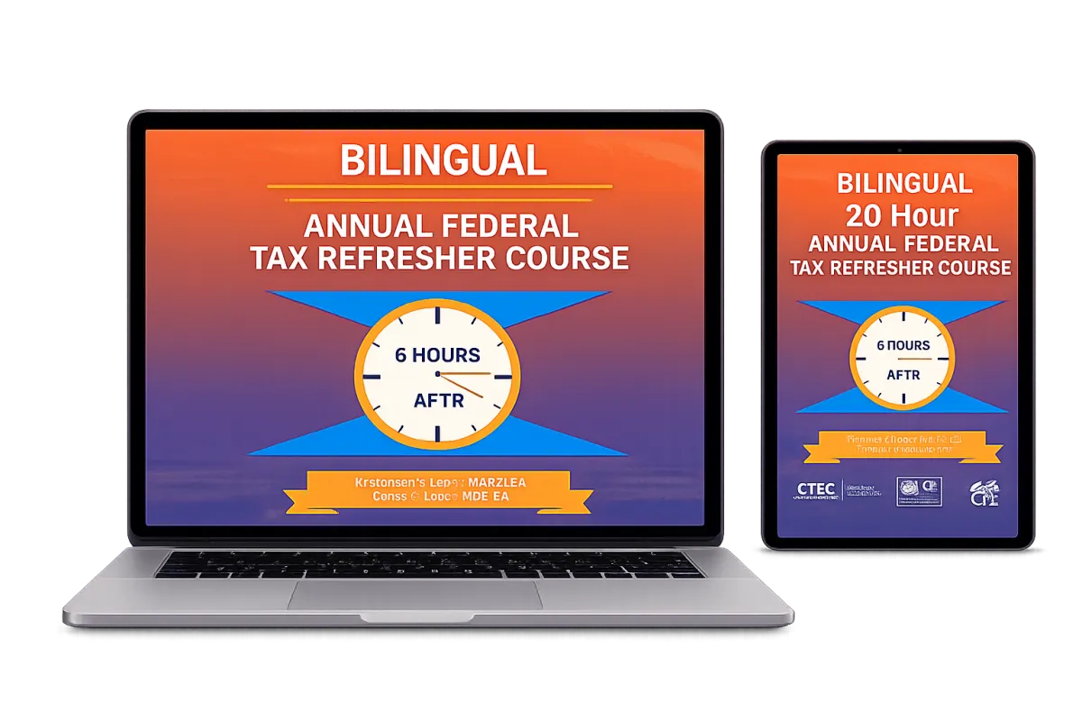 Our continuing education courses are offered by Latino Tax Pro, our official authorized provider, and are designed to keep you up-to-date with current tax laws and regulations. All credits earned are reported directly to the IRS in accordance with the continuing education program requirements, ensuring you meet the necessary regulations to maintain your professional status and continue practicing with confidence and compliance.
